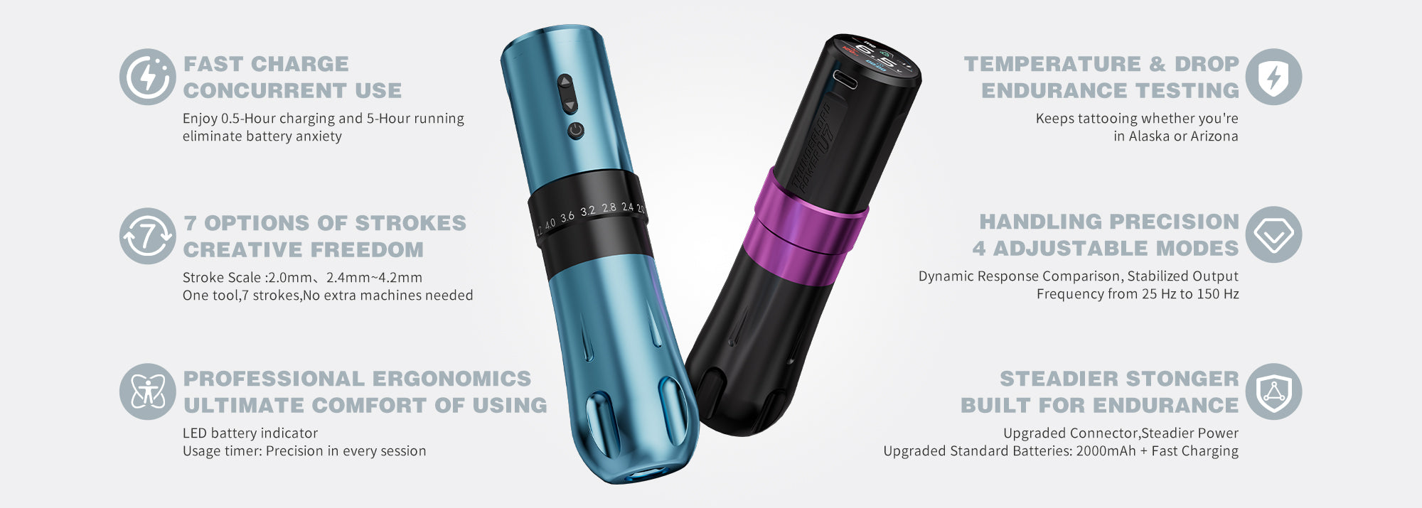 Equipped with three distinct power modes, it can fit tattoo requirements easily, from fine lines to dense shading.