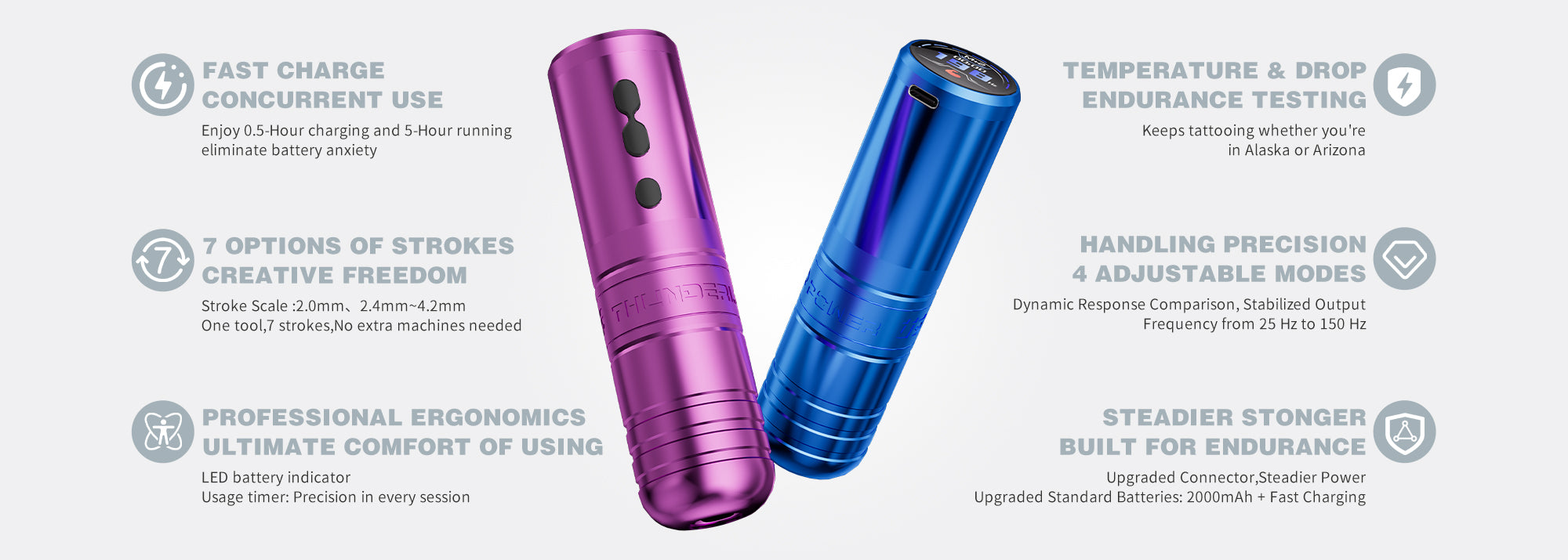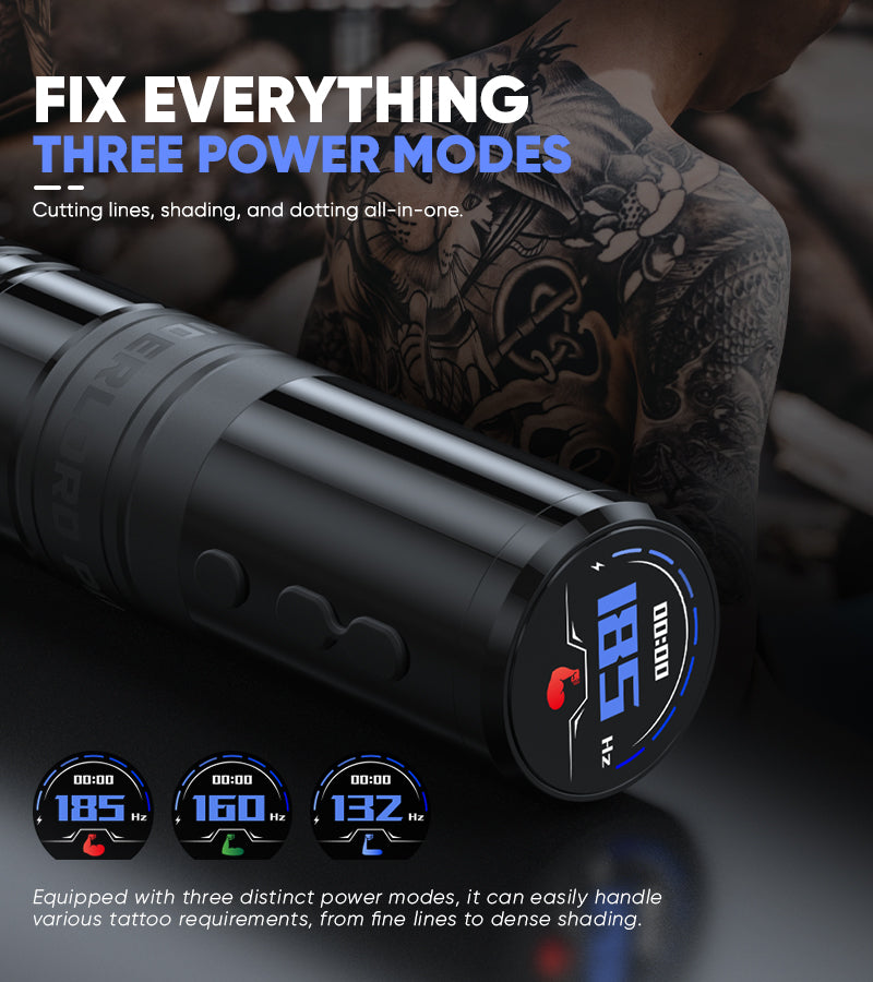 Equipped with three distinct power modes, it can fit tattoo requirements easily, from fine lines to dense shading.